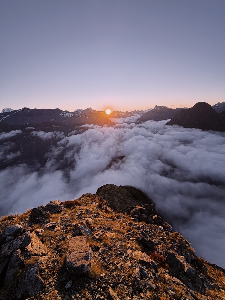 Climbing Mitre Peak has always been one of those missions that sits in the back of your mind. Most people admire it from the foreshore of Milford Sound, but very few get to stand on it. This trip was with my 17 year old son Tarn and our mate Takesh Mizoguchi Thorne. Takesh is a former professional surfer and body-flow specialist and this was his first ever overnight hike. We left Wanaka around ten in the morning and drove the four hours toward Milford. Every time I head through the Homer Tunnel the cliffs feel bigger and the valley smaller. When we arrived we launched an IRB and crossed the Sound. People can also do this mission by kayak or packraft and there are plenty of sheltered landings if you pick your line. We pulled up near the mouth of Sinbad Gully and looked up at the ridge we planned to follow. From the very first steps the terrain climbs aggressively through thick bush. There is no formed track but there is a clear line when you stay on the crest. Most of the time you are grabbing roots, shifting weight from hands to feet, and always gaining altitude. Eventually we popped out onto a small plateau. From here the terrain undulates gently before dropping down to around 700 metres where we camped for the night. In hindsight we should have pushed higher to the 900 to 1000 metre bivvy zone just beneath the steeper ridgelines, which is flatter, gives better views and sets you up well for day two. But we learned this the honest way. Dinner was simple and we spread out the sleeping system. We had Sea to Summit tents, bags and mats, although I forgot one mat, so I slept on a coiled rope. It did not feel luxurious but Tarn and Takesh slept well which mattered most. We woke at 4.20 am and were moving by 4.50. The goal was to be high on the ridge before sunrise and to beat any wind that might pick up later. We used a GPX route uploaded to our Garmin watches. There are no cairns or markers on Mitre Peak so having the breadcrumb line was very helpful especially after dark. We came up onto the ridge in the first minutes of sunrise. Milford Sound was still in deep shadow and there was silence, then the peaks lit up orange. It was a powerful moment to share as a father and son. From here the scrambling became exposed but the granite is solid. We worked along what is often called the goat track, with a few steep steps that required careful movements. There were still a few hardened snow patches and they were icy enough that we kicked in carefully before committing weight. The final section toward the summit is a series of two bumps. Tarn and I dropped packs with Takesh and we moved faster across the last ridge. There were one or two moves that you need to stay focused on but it felt rewarding rather than sketchy. We topped out around 7.40 am at 1700 metres. The Sound underneath us was glassy and the Tasman Sea sat low behind the Fiordland hills. It was one of those mornings that no photo could capture. We did not hang around because the descent on granite takes time if you want to stay safe. We met up again with Takesh and had breakfast. There was one short steep down climb that Takesh wanted a rope for, so we rigged a simple abseil. Everything after that was deliberate steps, using hands, facing in when required, and letting gravity do the work. Back through the bush and then finally out at the shoreline. The IRB was exactly where we left it. By three in the afternoon we were back in Milford enjoying a decent meal. On the way down we met two packrafters who we gave a lift as otherwise they would have been working hard against the wind. We finished the trip by driving south to Colac Bay and went surfing which was the perfect ending to a Fiordland adventure.